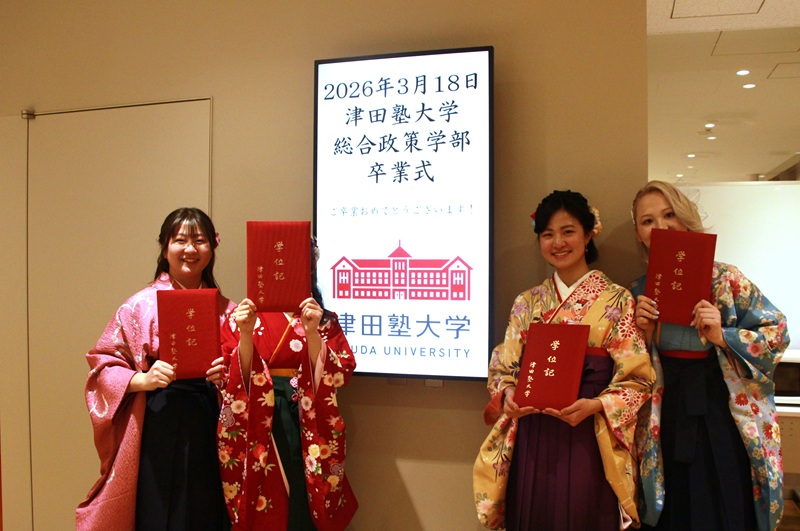 2026年3月18日、小平キャンパスにて2025年度の卒業式が執り行われました。千駄ヶ谷キャンパスで学んできた総合政策学科の学生も、この日は小平キャンパスで卒業式に出席します。式典では、卒業生一名ずつ名前が読み上げられ、その堂々とした返事や証書を受け取る姿からは、この数年間での確かな成長と、次の一歩を踏み出す強い決意が感じられました。一人ひとりの表情は自信に満ちており、教職員一同、頼もしく見守る時間となりました。