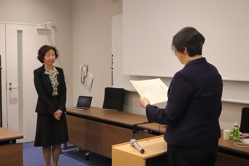 2026年3月27日、千駄ヶ谷キャンパスにて、多年にわたり教育・研究に尽力された大島美穂教授の退職に伴い、永年勤続表彰※1と津田塾友※2の称号授与を行いました。